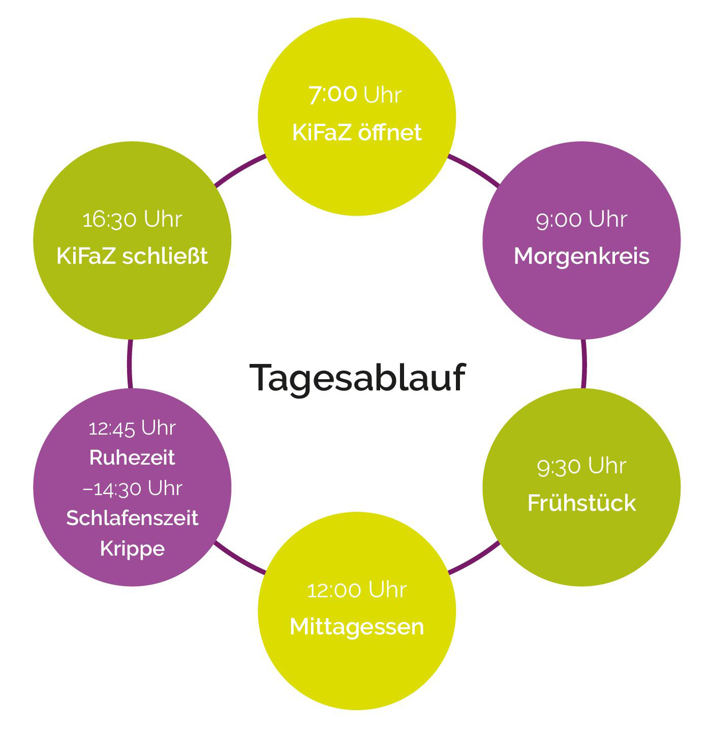 Im KiFaZ schenken wir allen Momenten im Tagesverlauf Aufmerksamkeit und Bedeutung. Wir sind der Überzeugung, dass jeder Augenblick für ein Kind bedeutsam sein kann. Nicht nur die offensichtlichen Angebote oder Spiel- und Bildungsimpulse, die wir mit den Kindern täglich gestalten, sind wichtig, sondern auch die gemeinsamen Mahlzeiten, die Begegnungen, Gespräche und stetig neu entstehenden Spielsituationen. Rituale schenken Orientierung im Tagesablauf. Gleichwohl erlebt jedes Kind seinen Tag individuell.